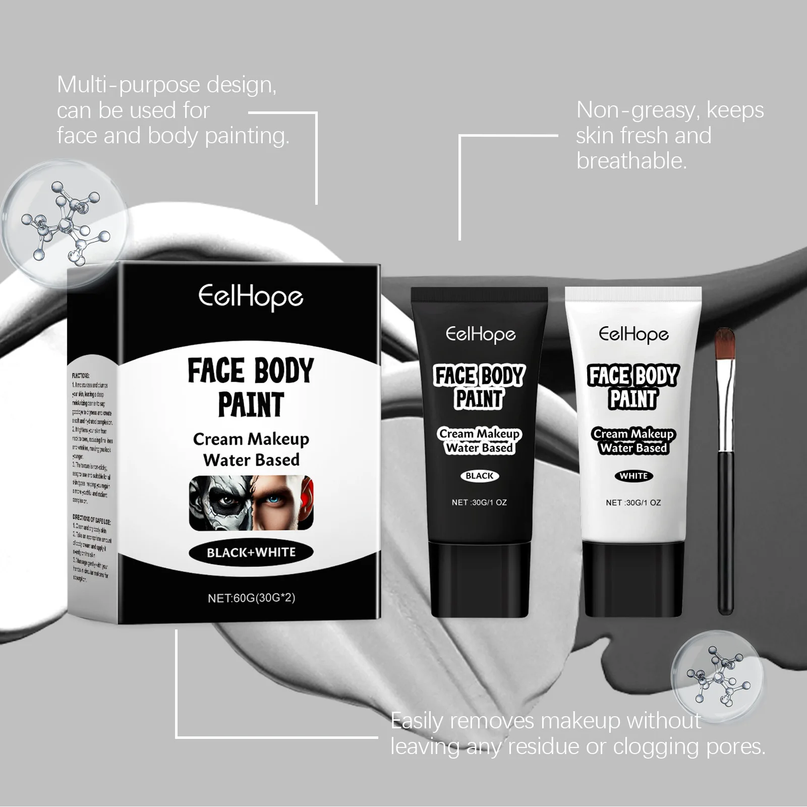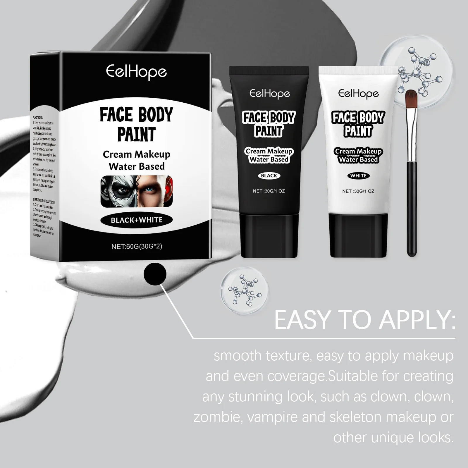 Halloween Face Painting Kit Highly Pigmented Face Body Brus Paint Black and White for DIY Cosplay Theme Parties Body Makeup 60g